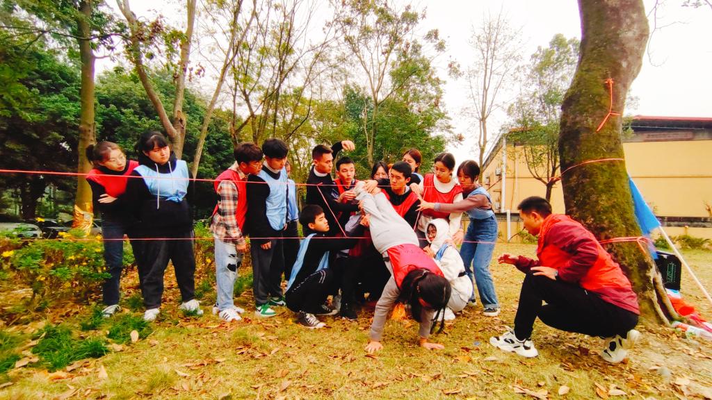 本次活动的主要形式为拓展类团建。同学们六人一组自由组合,分别自己的队伍设计队名、口号和队旗,通过“破冰行动”“争分夺秒”“群龙取水”等环节,有效调动和激发同学们相互配合、团队协作、着眼大局的能力,并在一定程度上锻炼了团队高效沟通能力和判断能力。通过“能量传输”锻炼队员间的相互信任和配合能力,在“穿越电网”中不断强化团队意识,挑战自我,并让同学们懂得感恩和付出。