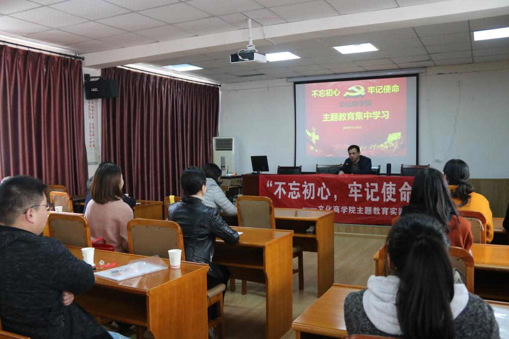 习近平总书记在十九大报告中指出,弘扬马克思主义学风,推进“两学一做”学习教育常态化制度化,以县处级以上领导干部为重点,在全党开展“不忘初心、牢记使命”主题教育,用党的创新理论武装头脑,推动全党更加自觉地为实现新时代党的历史使命不懈奋斗。2019年9月以来,文化商学院按照学校党委部署,扎实开展第二批“不忘初心、牢记使命”主题教育各项活动,坚持以上率下从严从实抓学习,深入学习领悟习近平新时代中国特色社会主义思想,以创新性思维滋养初心、引领使命,将推动主题教育各项活动落到实处。