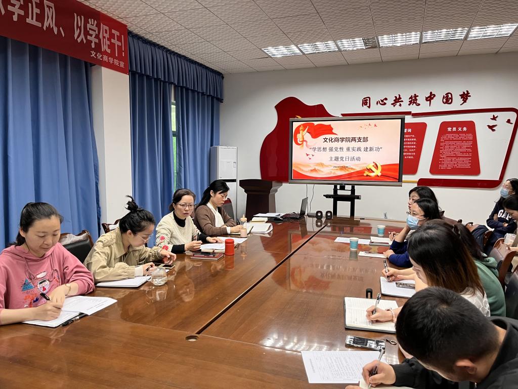 2023年4月28日上午,文化商学院两支部在温故楼三楼会议室联合开展了以“学思想 强党性 重实践 建新功”为主题的党日活动。会议由文化商学院党总支书记王维姝主持,全体党员参加了本次活动。