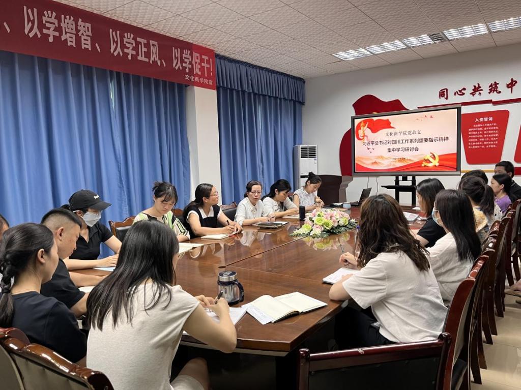 6月8日下午,文化商学院两支部在学校温故楼三楼会议室联合开展主题党日活动,深入学习贯彻习近平总书记对四川工作系列重要指示精神。活动由文化商学院党总支组织委员颜铃主持,全体党员参加。