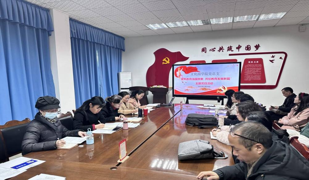 为深入贯彻落实全国教育大会精神,推动学院各项工作高质量发展,文化商学院两支部于2月28日联合开展“聚焦教育强国纲要,共绘教育发展新篇”主题党日活动。此次活动由党总支书记王维姝主持,文化商学院全体党员教师参加了活动。
