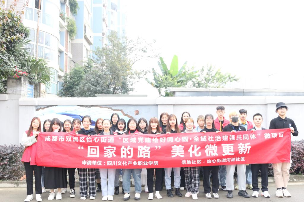 活动中,25名志愿者来到河池社区,负责绘画的志愿者在老师的指导下逐渐熟练地涂鸦填色,描绘出了美丽墙面;负责打扫社区环境的志愿者也在忙碌充实中将社区变得焕然一新。志愿者们饱满的热情、忙碌的身影引来社区居民的关注,给予了赞扬与感谢。面对记者的采访,我院志愿者积极向上、自信满满的发言充分体现了当代青年服务社会的风貌。活动结束后,大家合影留念。