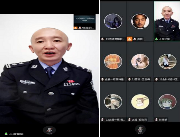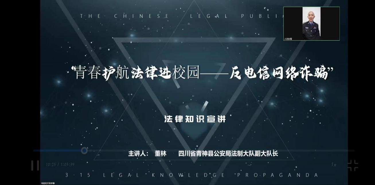 为加强校地交流,进一步增强学生学法、懂法、守法意识,培养良好的社会公德,提高明辨是非能力,提高学生安全防范意识,有效遏制校园电信网络诈骗案件的发生,构建和谐平安校园环境,11月4日,四川省青神县公安局董林警官通过腾讯会议为师生开展“反电信网络诈骗”专题讲座。文化商学院师生200余人在线聆听了本次讲座。