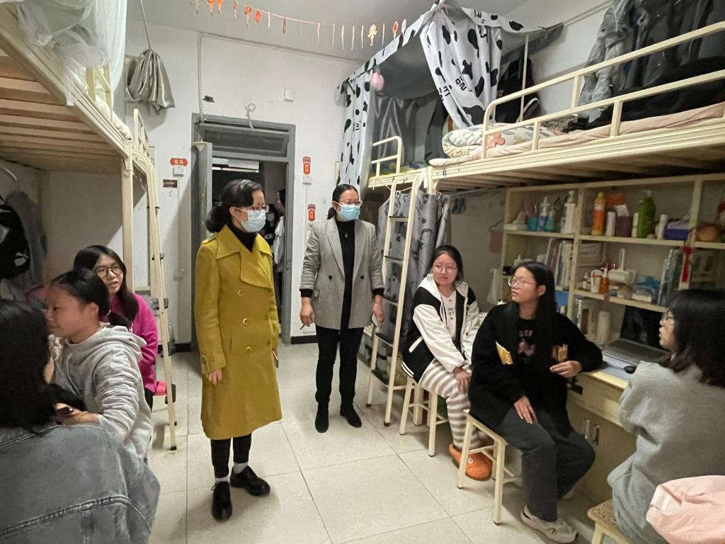 走访期间学院领导和老师们了解排查学生寝室整体安全、卫生状况,并关切的询问了同学们的生活学习情况,嘱咐同学要做好学习、生活规划。王维姝重点重点关注了同学们在疫情当下的心理状态和诉求,鼓励大家保持积极乐观、理性平和的心态。走访过程充满温暖笑意,同学们不仅能够自觉地维护干净整洁的宿舍环境,还对寝室进行了装扮美化,同时也严格落实学校安全用电的要求,杜绝用电隐患。对于在寝室自主认真学习的同学,老师们也给予了充分肯定。