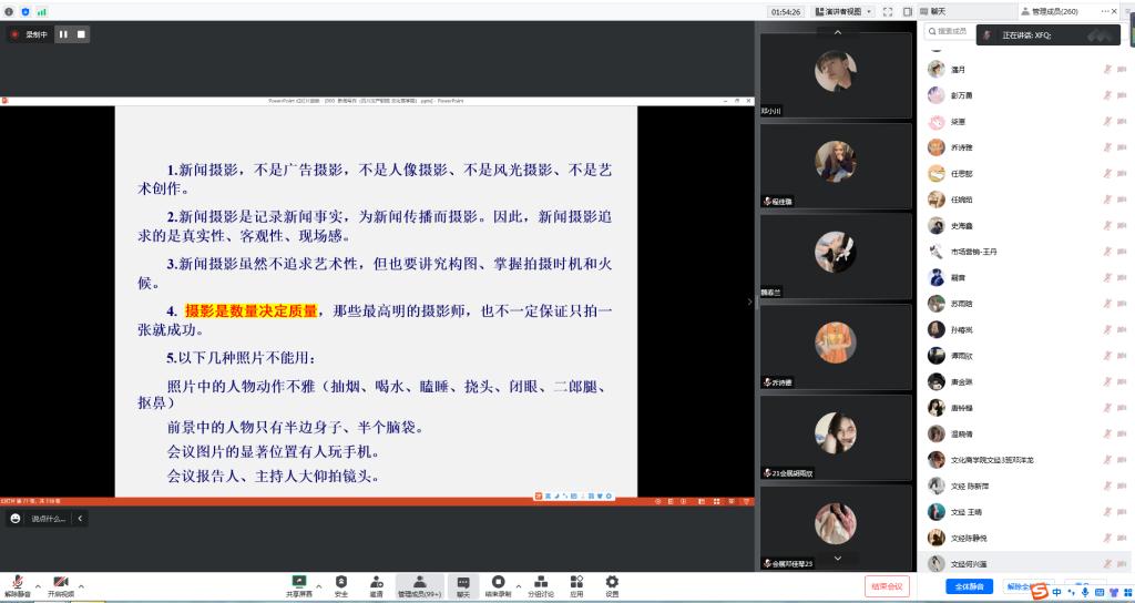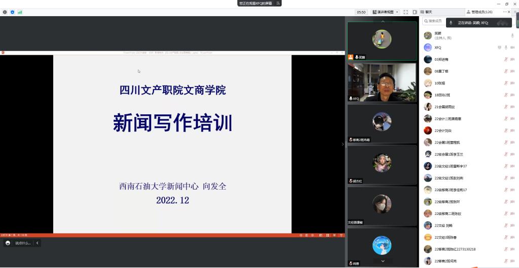 为提升学院师生在信息化时代撰写新闻的能力,2022年12月6日19:30,文化商学院在腾讯会议开展了新闻宣传能力提升培训。本次培训邀请到西南石油大学学报中心主任编辑向发全老师主讲,文化商学院宣传部指导老师颜铃主持。近300名文化商学院师生参加了培训。