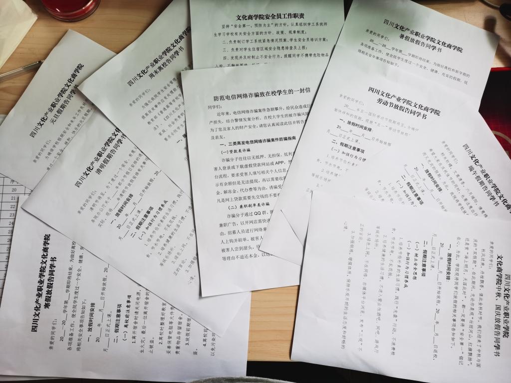 修订安全工作目录,强化制度保障。我院对安全工作进行细化梳理,在制度层面予以完善,将安全工作融入学院“党建领航、千日成长”党建品牌项目之中,修订安全工作目录,内容涵盖安全员工作职责、学生周末、寒暑假、法定节假日离校告知等内容,助力学院安全工作。