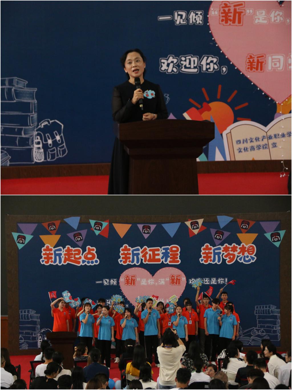 黄萍代表学院致辞。她指出,同学们于中国共产党建党百年之际步入大学,这是时代赋予的光荣印记。同学们应肩负时代使命,服务文化新经济,对接产业新商科,懂文化、能经营、会管理、擅服务是同学们的目标。她讲到,同学们的大学生活以青春为底,而青春又总是和梦想相伴,希望同学们找准目标、明晰寻梦的航向,勤学勤练、增强追梦的本领,坚韧不拔、砥砺圆梦的品格,怀揣美好期许踏上新起点、开启新征程、点燃新梦想,以梦为马、不负韶华、不负时代!