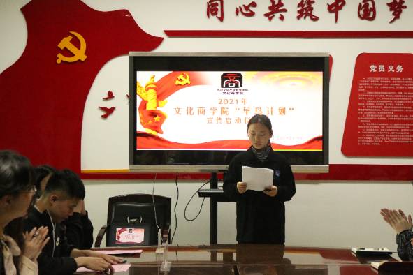 为了进一步加强学风建设,让广大青年学生养成积极、向上的生活、学习习惯,形成健康、文明的校园风貌,文化商学院在新学期推行实施了“早鸟计划”,倡导“早起、早读、早餐、早锻炼、早到课”——五“早”生活方式。3月19日,我院在温故楼三楼会议室举行“早鸟计划”宣传动员启动仪式,学院党总支副书记王维姝、全体辅导员老师、团学干部以及各班学生代表参加了本次活动。
