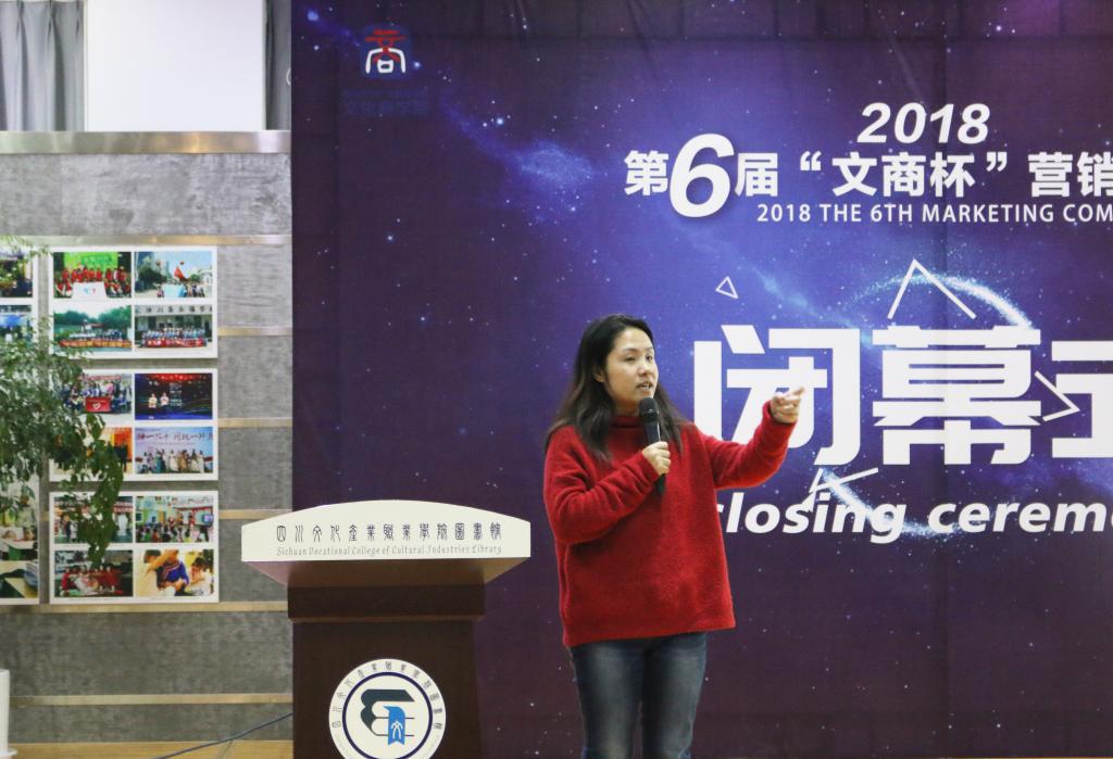 为进一步提高我校大学生的营销意识和营销技能,推动文化产品和市场营销二者的充分融合,文化商学院面向全校开展的“文商杯”第六届营销大赛于12月上旬在我校图文中心4楼举办了闭幕式,我院副院长邓颖颖、党总支副书记焦健、同为广告公司总经理蒙春松、综合科负责人周婷、专业教师代表和参赛队员出席了本次活动。