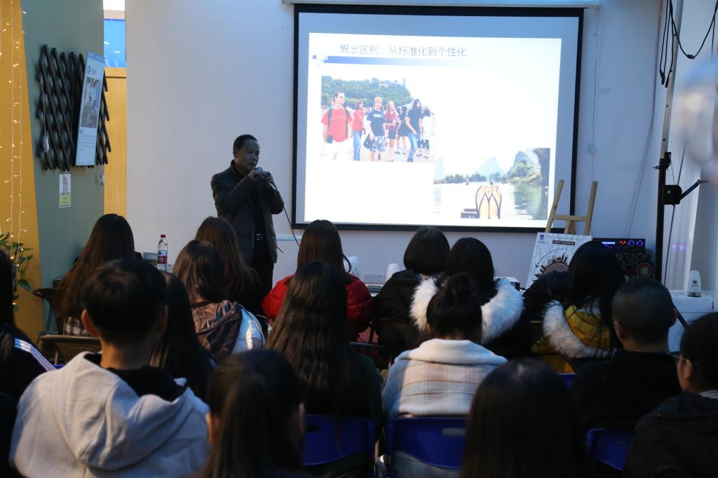 廖荣隆先生从事旅游业多年,在定制旅游方面也有着丰富的实践经验。他以自身从业经历为案例,向同学们指出,定制旅游是旅游业从标准化经营向个性化体验过渡而产生的必然需求,也是未来旅游业的发展方向。尤其是随着大众生活水平的提高和消费观念的转变,定制旅游将会越来越受欢迎。廖荣隆先生还指出,同学们如果想今后从事定制旅游这项具有高度挑战性的工作,除了经验积累外,还需牢记“特色是旅游之魂、文化是旅游之基、环境是旅游之根、品质是旅游之本”。