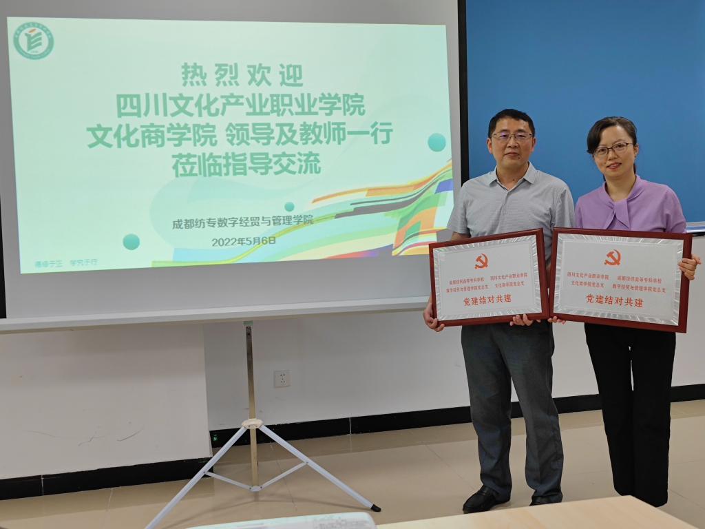 会上还举行了四川文化产业职业学院文化商学院党总支和成都纺织高等专科学校数字经贸与管理学院党总支的党建结对共建仪式,双方表示将在党建互促、项目互联、人才互通上深化交流,实现优势互补、信息共享、共同提高。