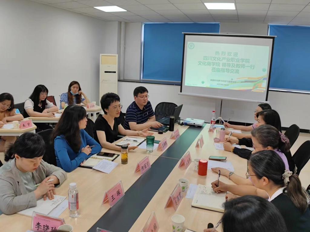 2022年5月6日上午,文化商学院班子成员、科室召集人、骨干教师一行17人前往成都纺织高等专科学校学习交流。成都纺织高等专科学校数字经贸与管理学院院长王浩澂、党总支书记王霖、副院长夏远江、党总支副书记何酉宁等给予热情接待。