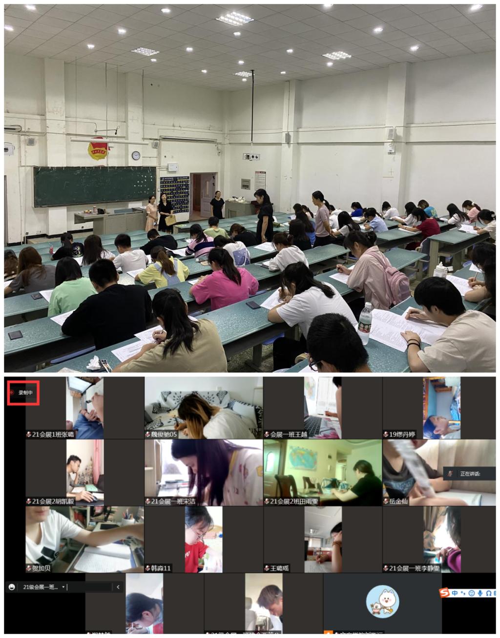 考试期间,学院组织进行线上线下同步巡考,线上监考老师利用腾讯会议进行远程视频监考,并全程录屏,严肃考风考纪,确保线下线上同步考试平稳顺利进行。学院领导深入考场一线检查指导工作,认真查看考试安排、考风考纪、考场秩序、试卷命题等,对本次考试秩序予以肯定;监考教师以高度的责任心投入到监考工作,工作细致严谨,认真履行监考职责,严格执行考场纪律;同学们自觉遵守学校考试纪律,贯彻学校疫情防控工作要求,考场规范有序、秩序井然,考风考纪良好。