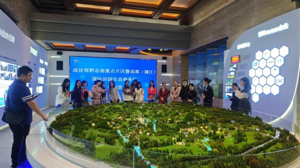 蒲江商务区负责人江兵带领参观蒲江麟凤村商务区,重点介绍商务区的规划、建设和运营情况,调研团队详细了解该区在绿色生态、三产融合、创新示范方面的探索实践。在全国先进个人陈灿平博士的直播基地,调研团队参观了解了电商直播行业业态、直播技术设施等,并与当地文化产业管理部门及相关企业就职业教育如何赋能乡村振兴,产教融合如何推动地方经济发展展开交流和讨论。