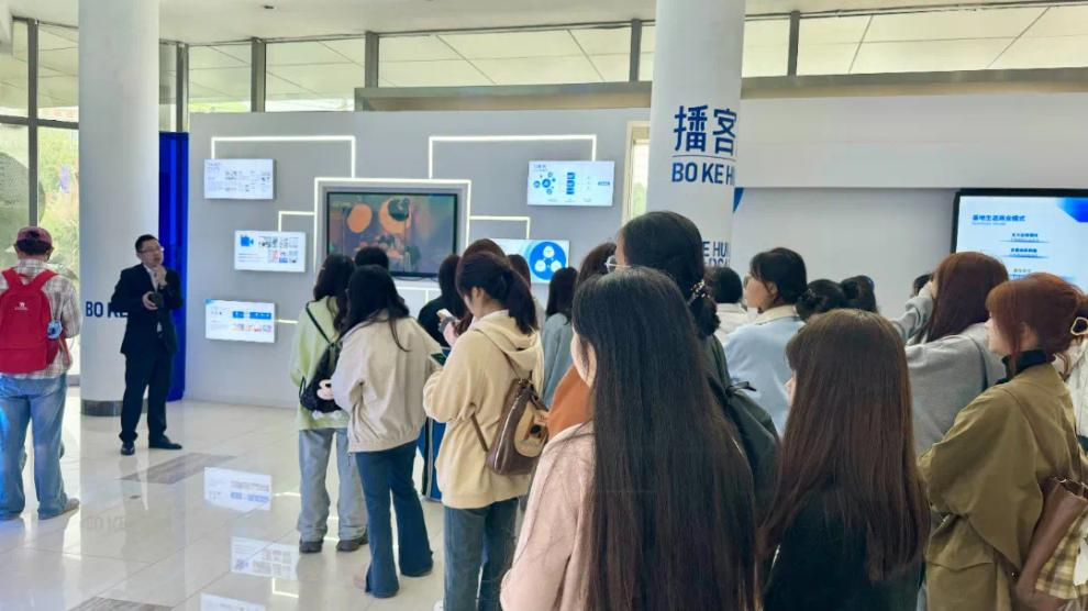 在基地负责人牛章后的带领下,同学们对基地运营、电商直播模式、数字营销产业发展等方面有了全面的了解,随后参观了播客汇公共服务中心、供应链选品中心、独立主播达人工作室以及实景直播间,深入探究了直播电商背后的产业链流程和整体运作模式。座谈交流环节,学生们积极提问,与基地工作人员进行了深入的交流。同学们纷纷表示,通过参观学习,对数字经济时代电子商务的供应链管理和产业业态有了更全面的了解,也对未来从事相关职业充满期待和信心。
