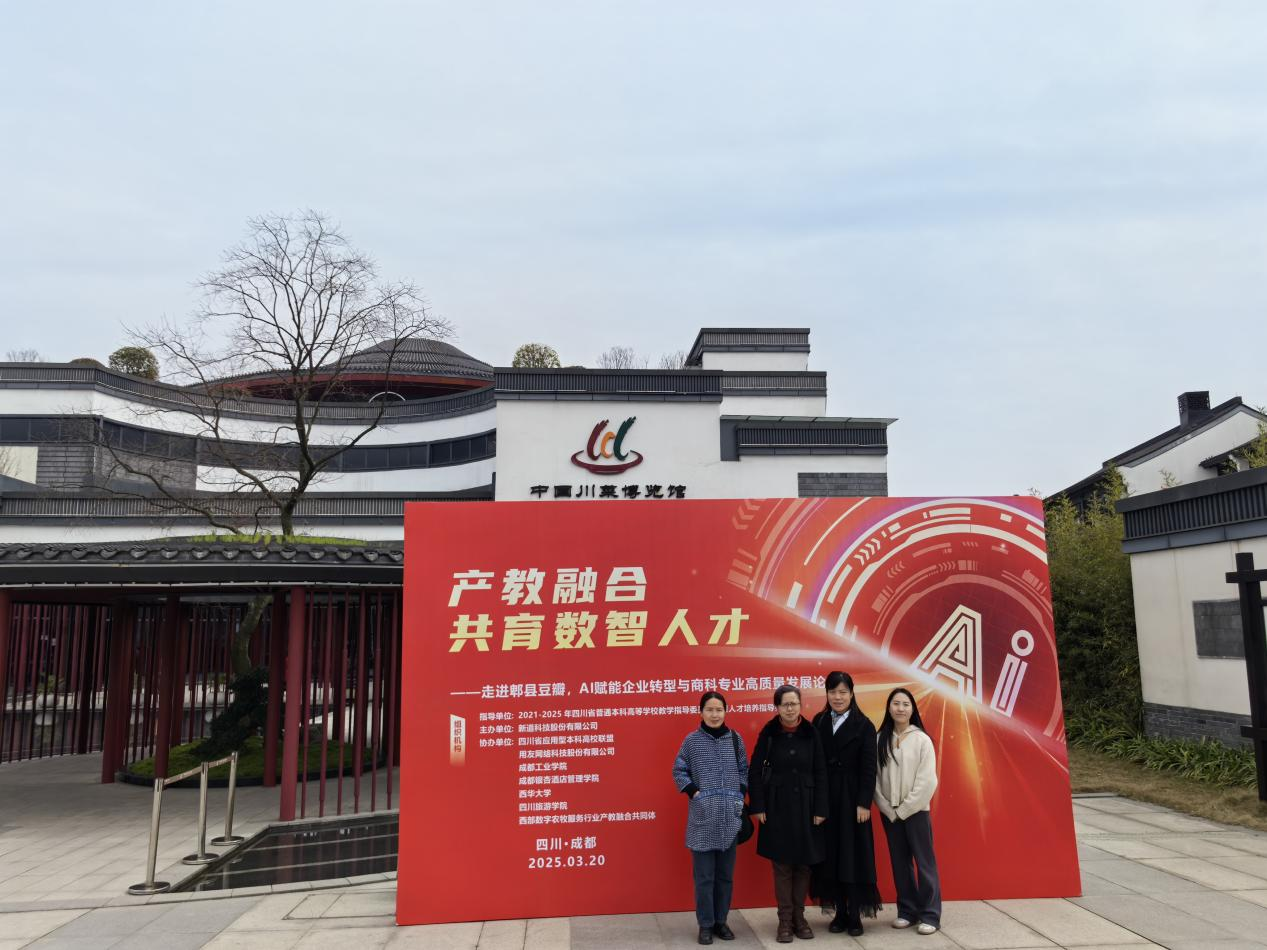 为深入了解AI赋能数智商贸企业转型新趋势,增强职业教育的适应性,3月20日下午,文化商学院受邀参加由新道科技股份有限公司主办的“产教融合·共育数智人才——走进郫县豆瓣,AI赋能企业转型与商科专业高质量发展论坛”并开展访企拓岗,学院党总支书记王维姝、副院长曾兴及大数据与会计专业主任李晓玲出席活动。