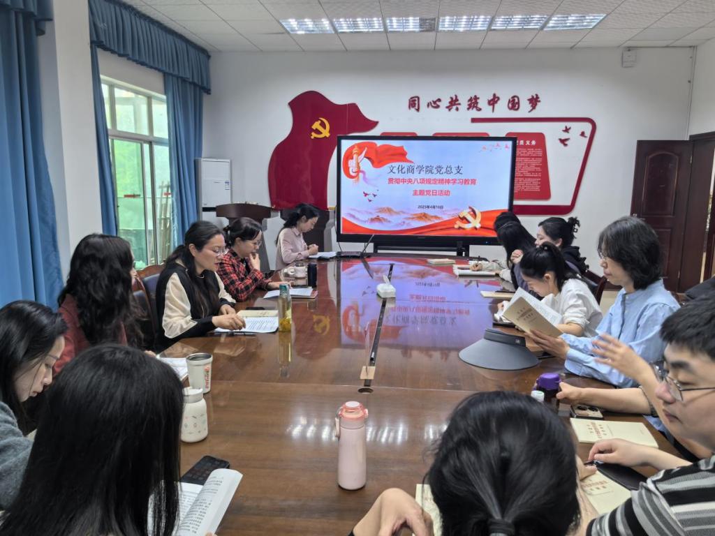 2025年4月10日,文化商学院两支部在温故楼三楼会议室举行“贯彻中央八项规定精神学习教育”主题党日活动,学院全体党员参会。