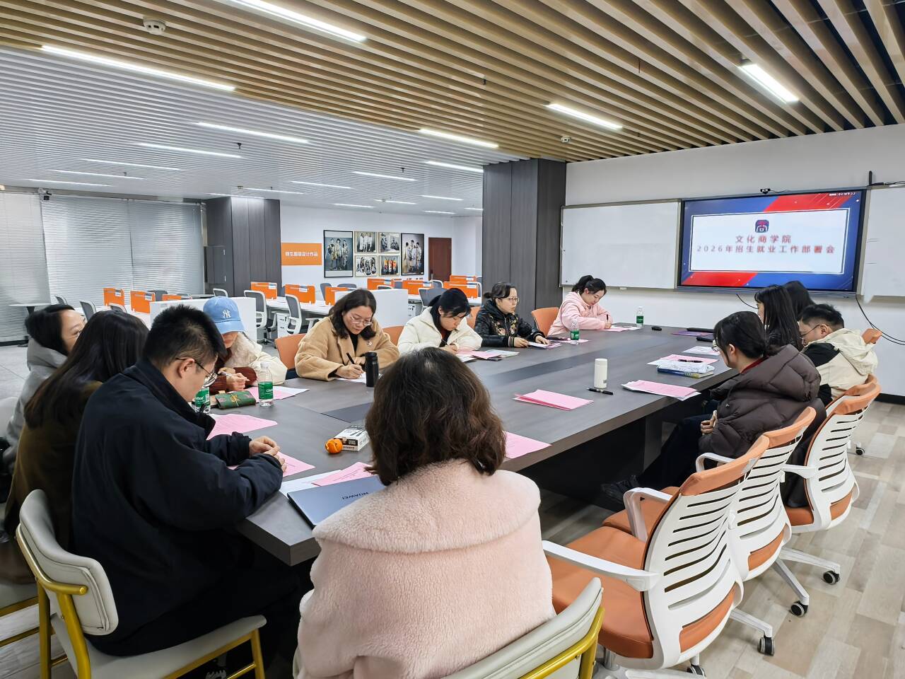 为推进招生与就业工作提质增效,2026年1月16日,文化商学院在图情大楼六楼教师教学发展中心召开2026年招生就业工作部署会。学院党政班子成员、各专业主任、各科室负责人、毕业班辅导员及就业干事参会。